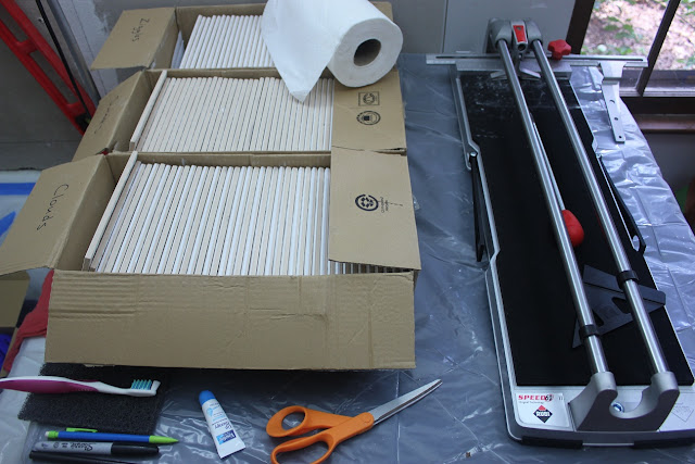 My pre-sorted tile, tile cutter, paper towels, pencil and sharpie for marking the cement board, China marker for marking where to make cuts on the tile (very useful! it wipes right off), scrubbing pad and old toothbrush (also really useful for getting wet and getting rid of any thinset that squeezes out through the grout lines), scissors that I didn't need and chapstick (because I can't live without it).